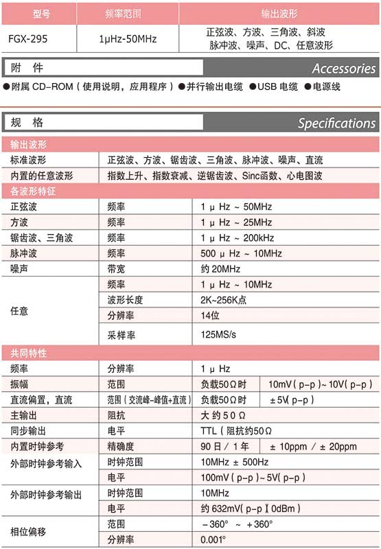 FGX-295任意波形函數(shù)信號發(fā)生器(50MHz),能輸出正弦波、方波等5種標(biāo)準(zhǔn)波形,還可以采用專用軟件輸出任意波形,另還具有AM/FM調(diào)制,掃頻和脈沖串功能。