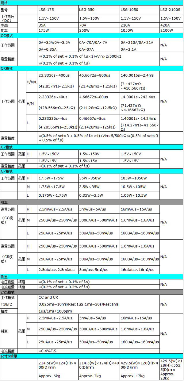 LSG系列擁有單通道,有7種操作模式,CV(定電壓),CC(定電流),CR(定電阻),CP(定功率),CC+CV,CR+CV,CP+CV。在CC和CR模式下,它的序列功能可以模擬各種動態(tài)負載特性。序列功能允許通過指定的負載電流,上升/下降斜率,電流水平,持續(xù)時間和其他參數(shù)來編輯負載曲線。